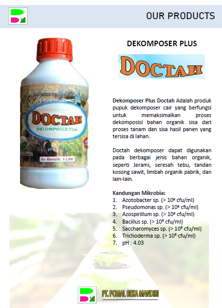 Aadalah produk pupuk dekomposer cair yang berfungsi untuk memaksimalkan proses dekomposisi bahan organik sisa dari proses tanam dan sisa hasil panen yang tersisa di lahan.